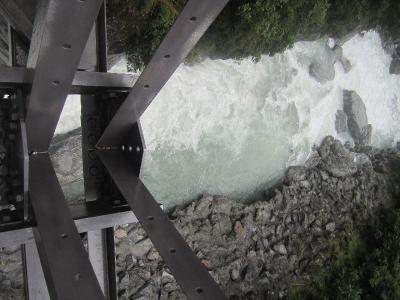 Wir ziehen uns um und gehen zur Mitte der Brücke. Das Wasser sieht kühl und klar aus. Die Tiefe passt. Nach kurzer Unterhaltung mit einem Typ, der wie ein Texas Rancher aussieht, machen wir uns zum Sprung bereit. Das Kühlen ist bestimmt gut, und danach wasche ich die Wunde ja aus, rede ich mir den Sprung schön ;-). Wir springen, der Texas Typ macht Fotos. Nette Leute hier in NZ. Er lacht sich später noch halb tot, da ich mir die Nase zuhalte ;-).
